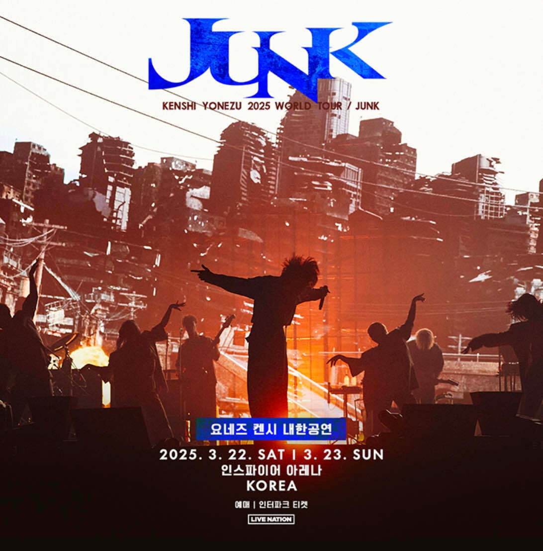공연정보 - 공연명: 요네즈 켄시 내한공연 (KENSHI YONEZU 2025 WORLD TOUR / JUNK) - 공연 일시: 2025년 3월 22일 (토) 오후 7시, 2025년 3월 23일 (일) 오후 6시 - 공연 장소: 인스파이어 아레나 - 관람 등급: 전체관